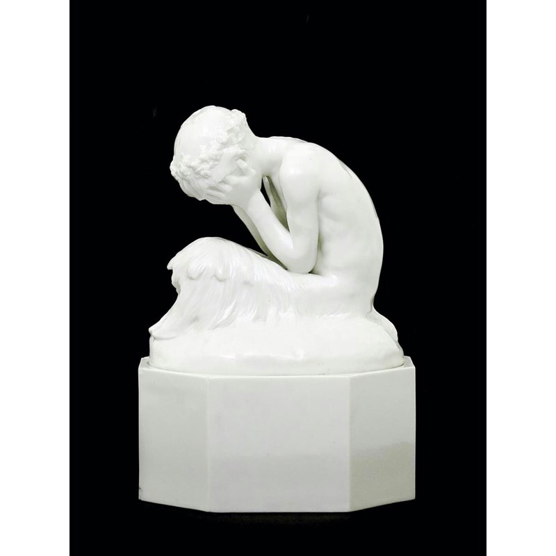 'Weeping Faun on Stand' a rare Royal Copenhagen model designed by Gerhard Henning, designed 1910, model no.1188, covered in a blanc de chine glaze, on octagonal plinth printed wave mark, small flat chip to top of plinth 17.5cm. high