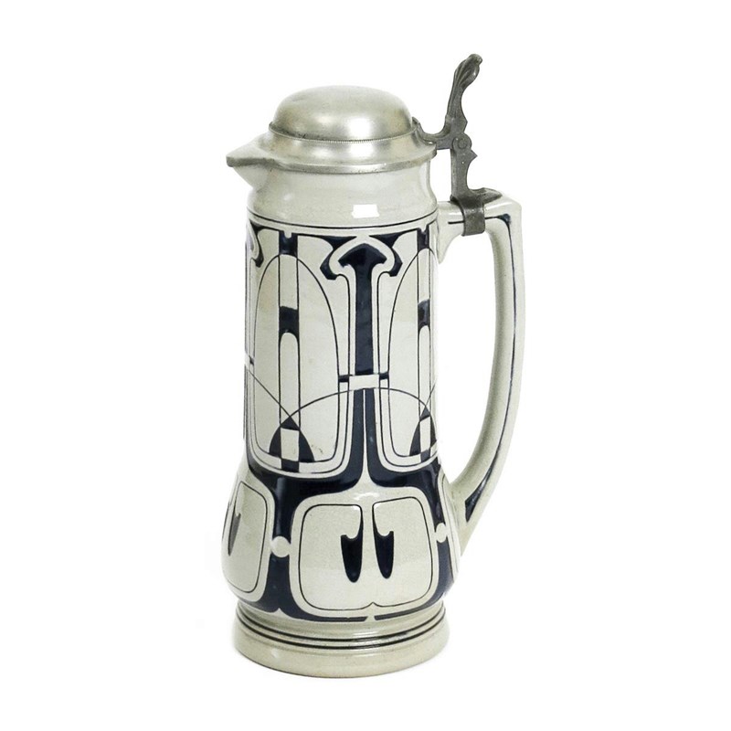 A Secessionist stoneware ewer the design attributed to Peter Behrens, model no.1690, cast in shallow relief with a Secessionist entrelac design glazed blue on a grey ground with hinged pewter cover, impressed marks, 31cm. high