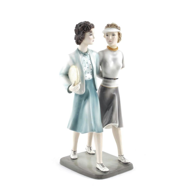 A Goldscheider Pottery figure group of two tennis female tennis players designed by Stephan Dakon