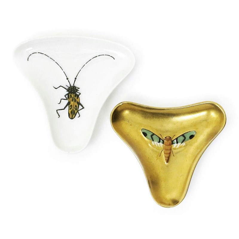 A pair of Theodore Haviland Limoges dishes designed by Edouard Marcel Sandoz, triangular shape, one modelled in low relief with a moth, the other a beetle, in colours on a gold and white ground printed mark, facsimile signature 10.5cm. wide