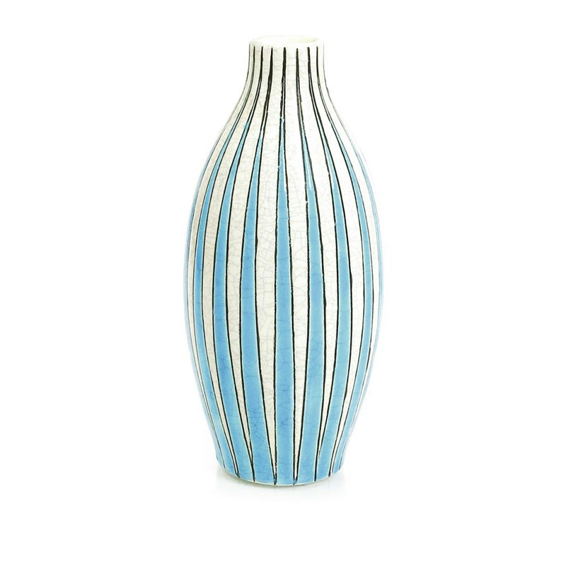 A Boch Freres Keramis vase designed by Maurice Dufrene for La Maitrise, pattern no.D.710, enamelled with sky blue columns, outlined in black on a crackled white ground printed and painted marks, 27cm. high