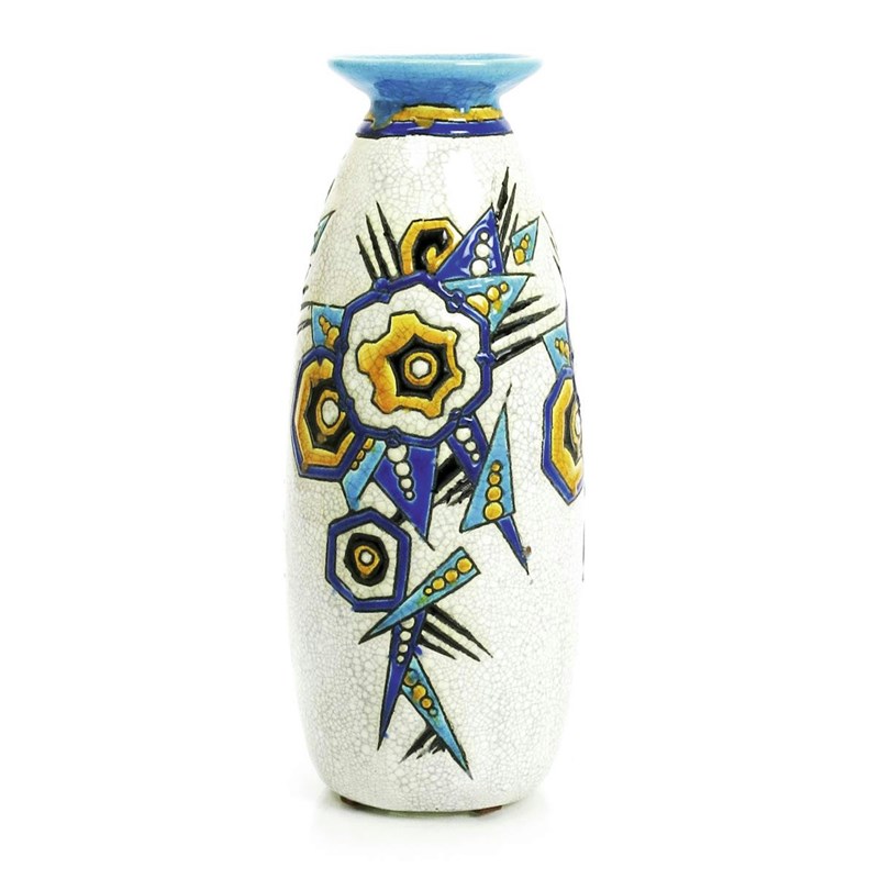 A Boch Freres Keramis vase designed by Charles Catteau, pattern D.1174. shape 844, enamelled with geometric flowers and foliage in shades of blue, yellow and black on a crackled white ground printed factory marks, professionally restored rim, 31.5cm. high