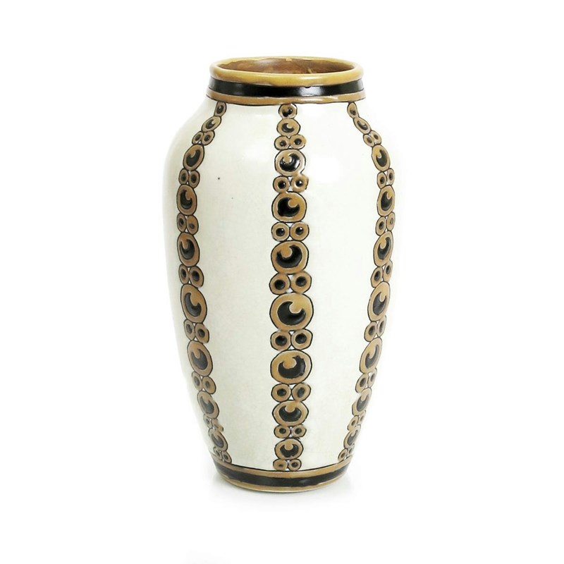 A Boch Freres Gres Keramis vase designed by Charles Catteau, pattern D.922, enamelled with columns of circular geometric patterns, in mushroom and black on a lightly crackled cream ground printed, painted and incised marks, 28cm. diam.