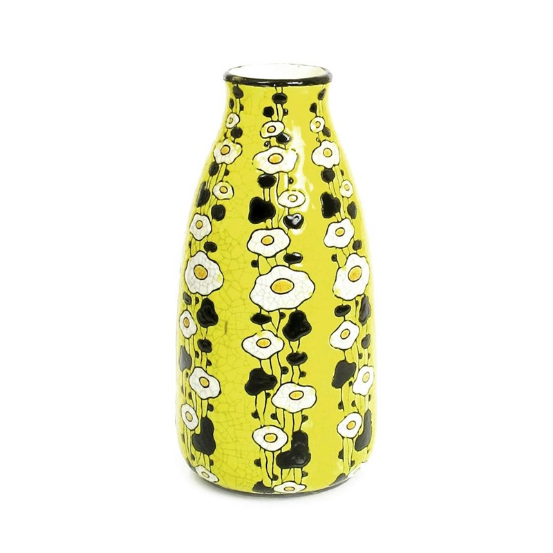 A Boch Freres Keramis vase designed by Charles Catteau, pattern D.815, painted with columns of stylised flowers in white, black and yellow on a vivid crackled lemon ground printed and painted marks, 29cm. high