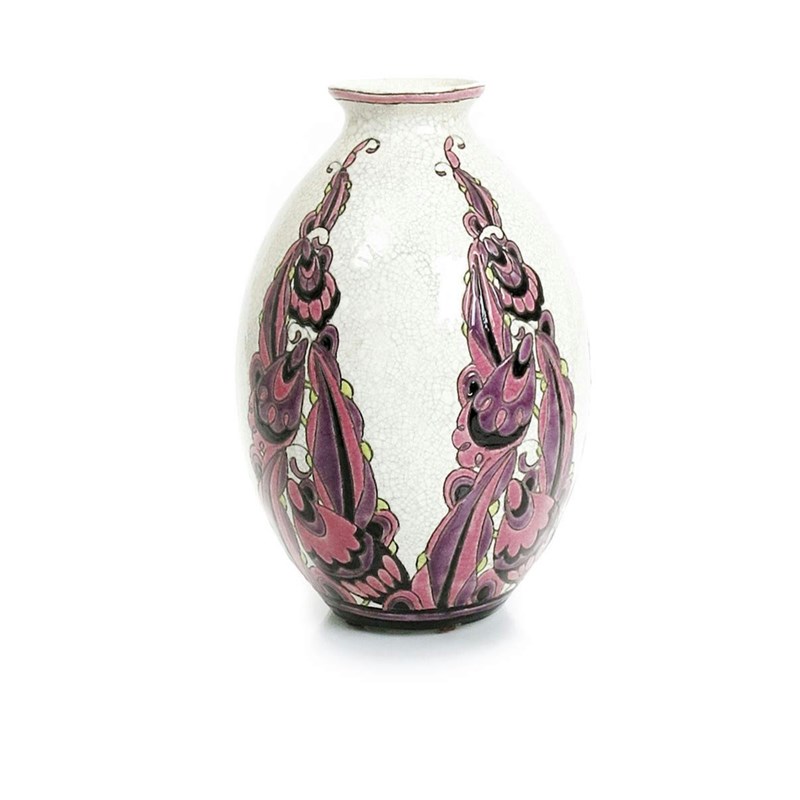 A Boch Freres Keramis vase designed by Charles Catteau, pattern D.1099, painted with columns of stylised flowers and foliage in shades of pink, yellow and black on a crackled white ground printed and painted marks, 31cm. high