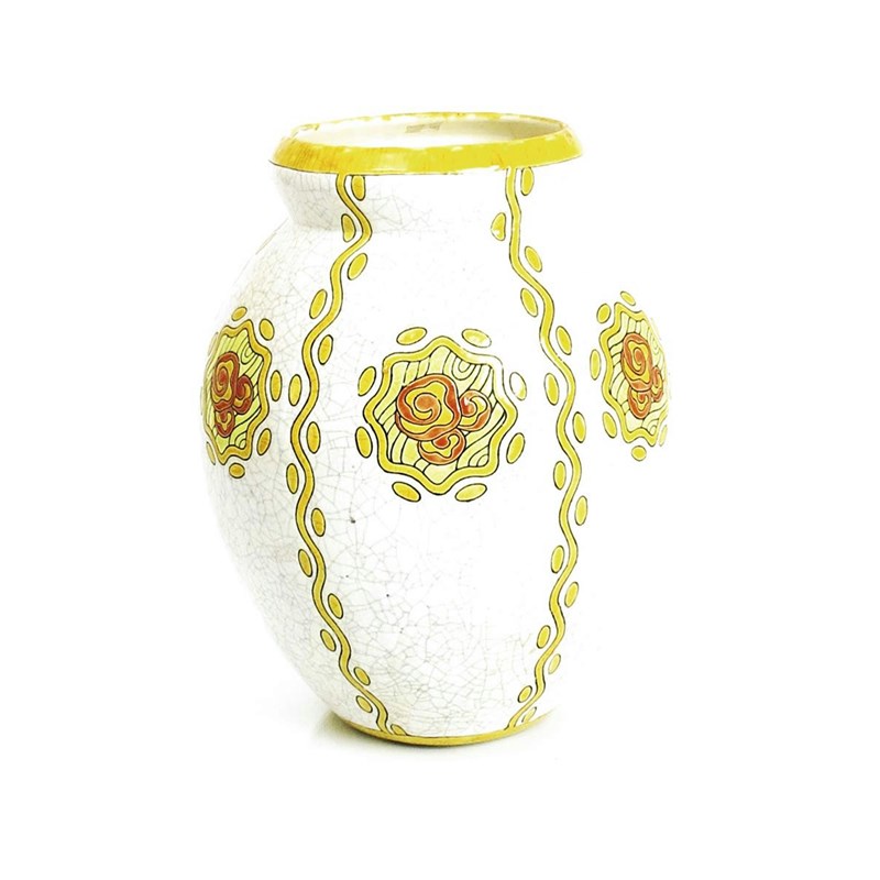 A Boch Freres Keramis vase designed by Charles Catteau, pattern D.750, painted with stylised flowerheads in shades of yellow and orange on a crackled white ground impressed and printed marks, facsimile signature 35cm. high