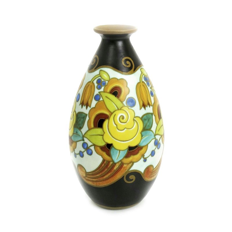 A Boch Freres Keramis vase designed by Charles Catteau, painted by Leon Delfant, pattern D.1733, painted with stylised flowers in colours on a matt brown ground printed and painted marks, painted LD monogram 32cm. high