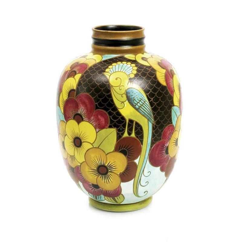 A Boch Freres Keramis vase designed by Charles Catteau, pattern D.1740, painted with an exotic bird amongst stylised flowers and foliage, in colours printed and painted marks, 36.5cm. high