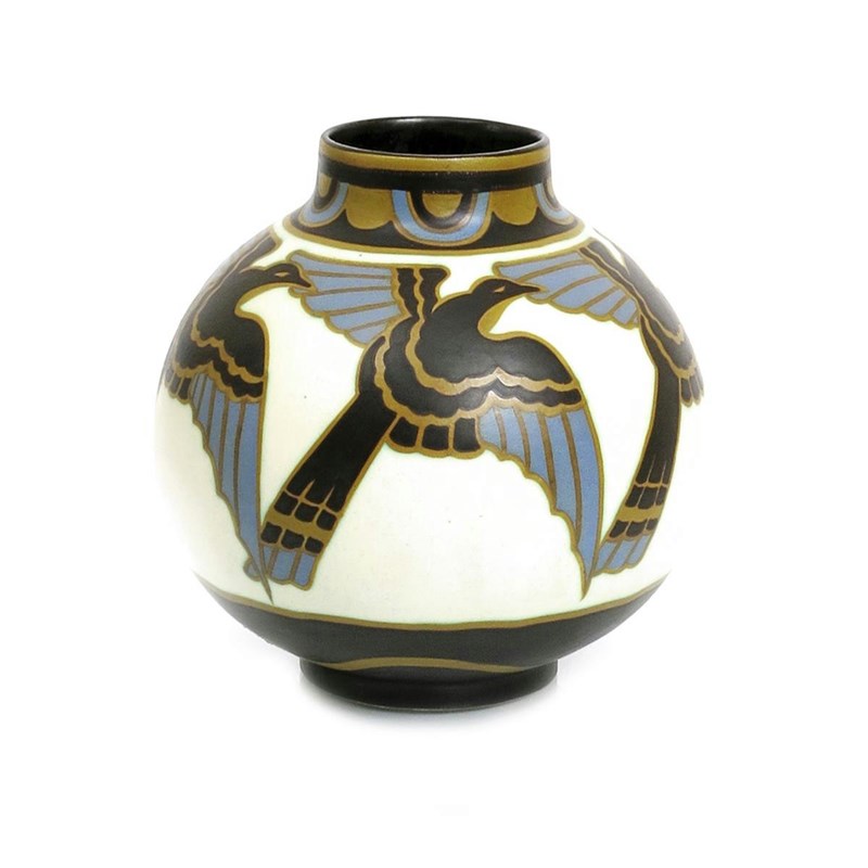 A Boch Freres Keramis vase designed by Charles Catteau, pattern D.1366, shape 894, painted with a frieze of flying birds in colours on a cream ground 24cm. high