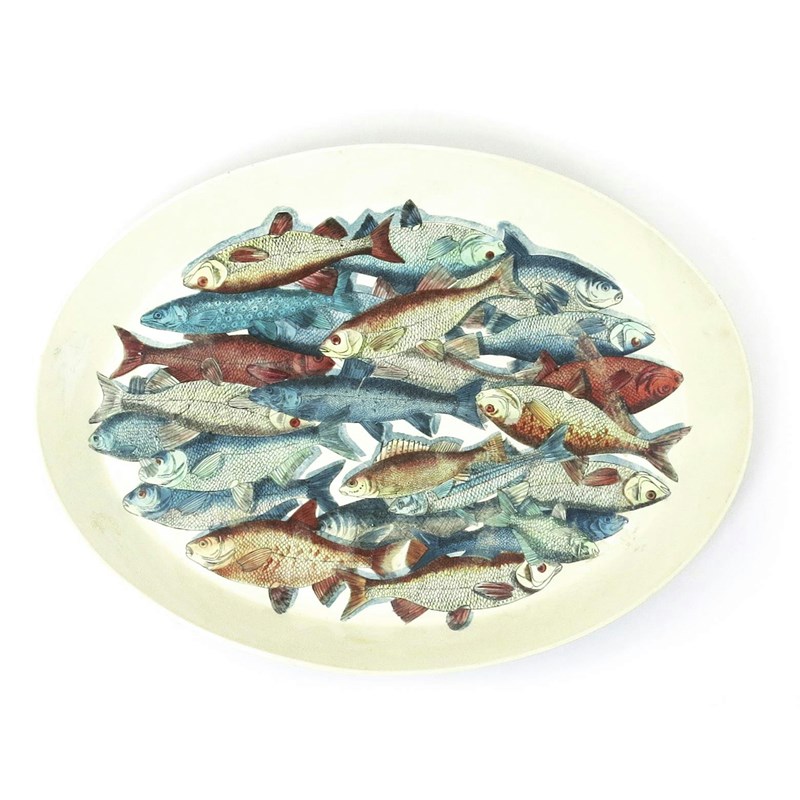 A Fornasetti enamelled tin tray designed by Piero Fornasetti, elliptical form, enamelled with a shoal of fish in colours retail label to reverse 46cm. wide