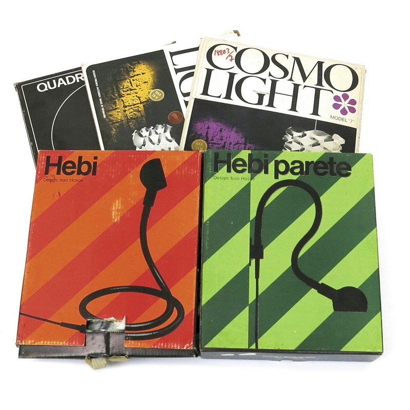 Two Hebi Parete Isao Hosoe lights, in original packaging, three Cosmo Light shades designed by Preben Jacobsen, in original packaging, an enamelled metal hanging light and three metal trays