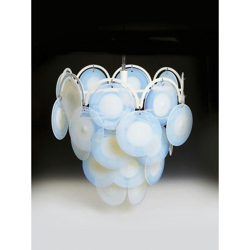 A Vistosi glass and metal ceiling light, the tapering frame with hooks, each mounted with a white glass disk unsigned 104cm high
