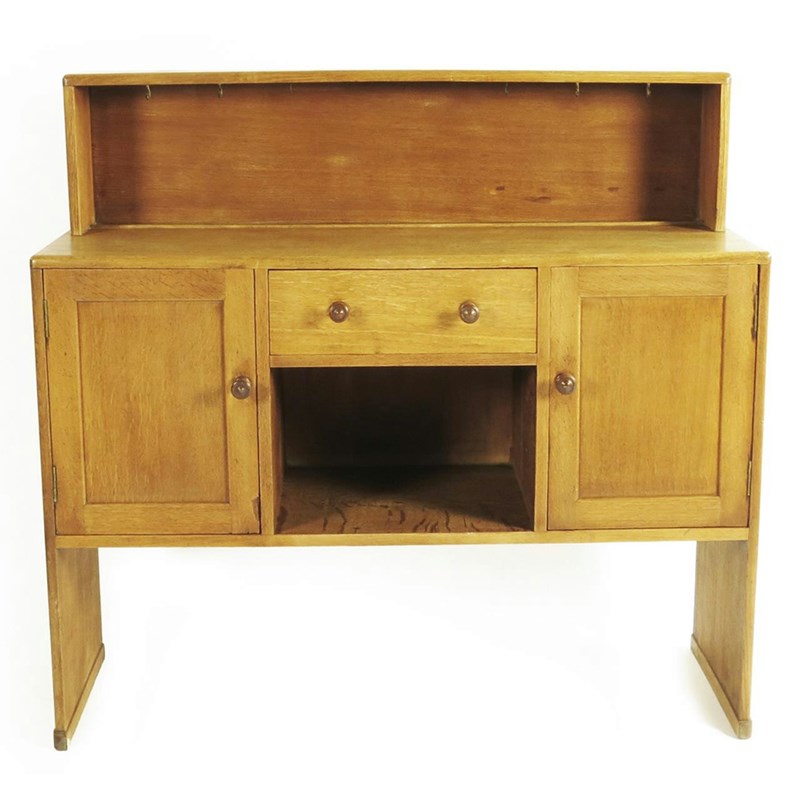 A Heal's weathered oak sideboard, central drawer with flanking cupboards, below mantle with metal cup hooks, inset ivorine label 129cm. wide, 122cm. high