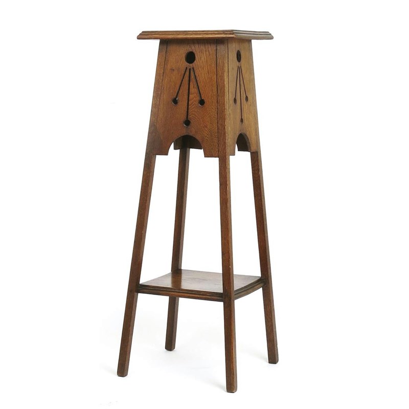 An Arts and Crafts oak jardiniere stand, square top with flaring legs, with pierced decoration to substructure, 91cm high, top 25cm square