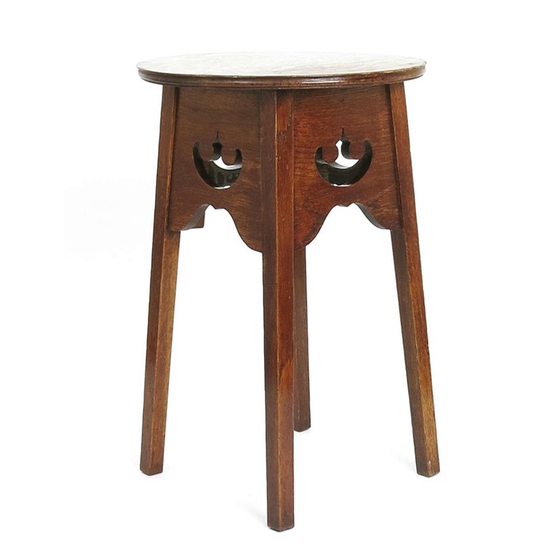 An Arts and Crafts oak side table, circular top with pierced decoration to substructure, 50cm.high, 33.5cm diam.