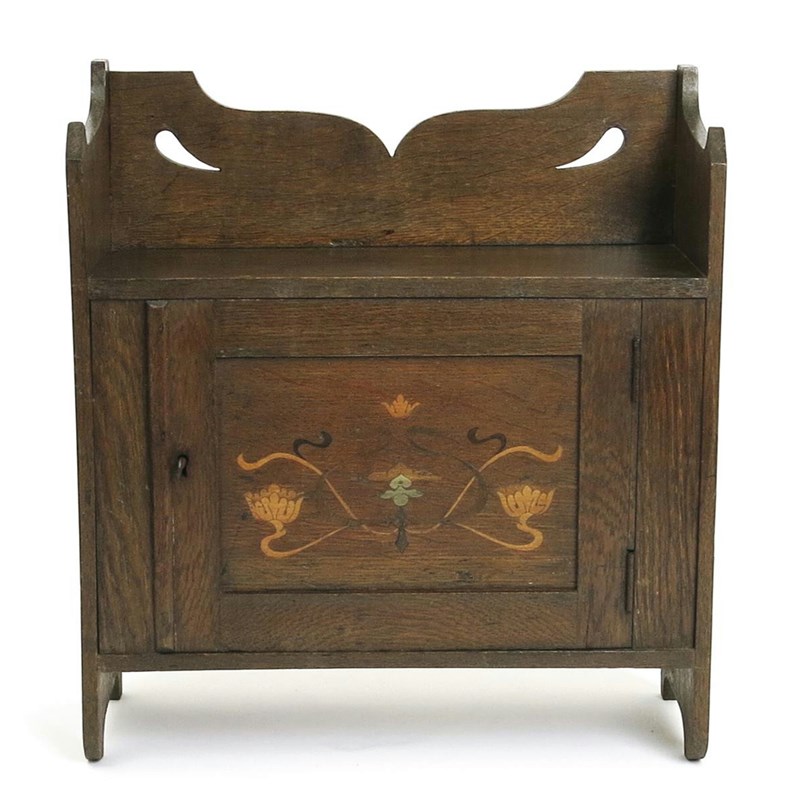An Arts and Crafts oak wall cabinet, possibly Shapland & Petter, the hinged door with pewter and marquetry floral inlay painted 236 to reverse 39cm. wide