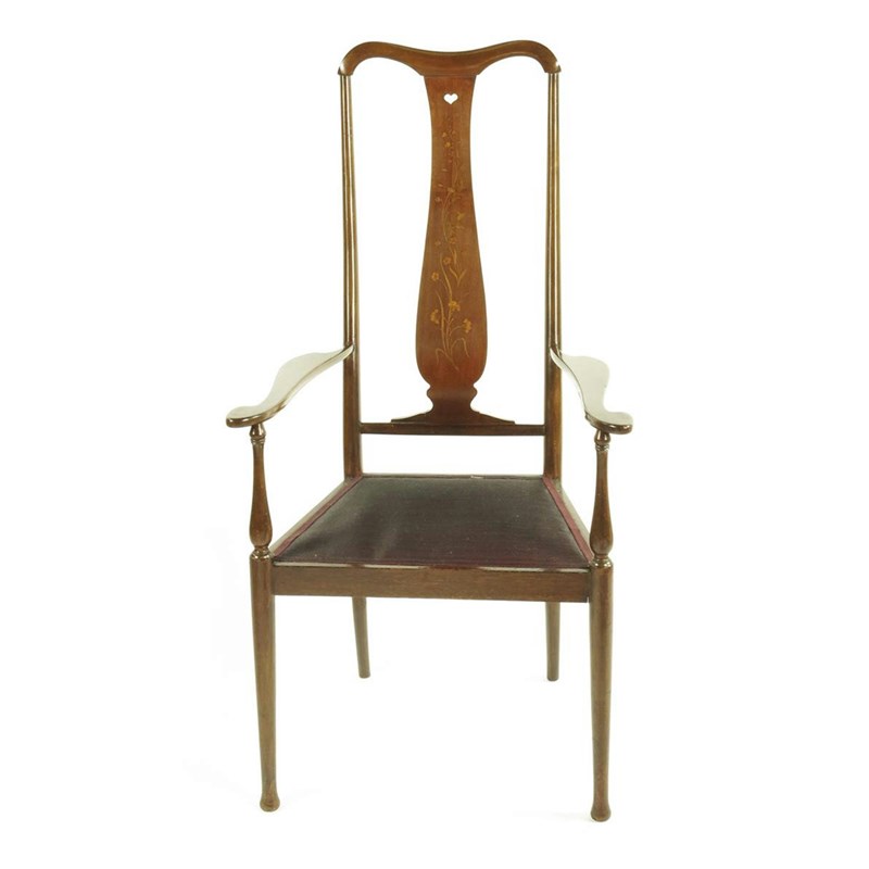 A mahogany Brussels longback armchair designed by George Walton, the back-splat inlaid with harewood flower panel 122cm. high