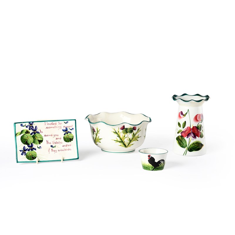 14.5cm wide; and inscribed 'I looked for something sweet to send to you and the Violets asked if they would do', in colours, a Wemyss Sweet Pea Grosvenor vase, a small Black Cockerel bowl and a Thistle bowl with wavy rim