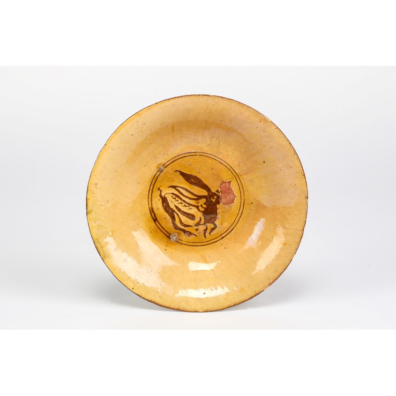earthenware, with a lustre type glaze over a honey ground, decorated with slip showing a hare within a circle