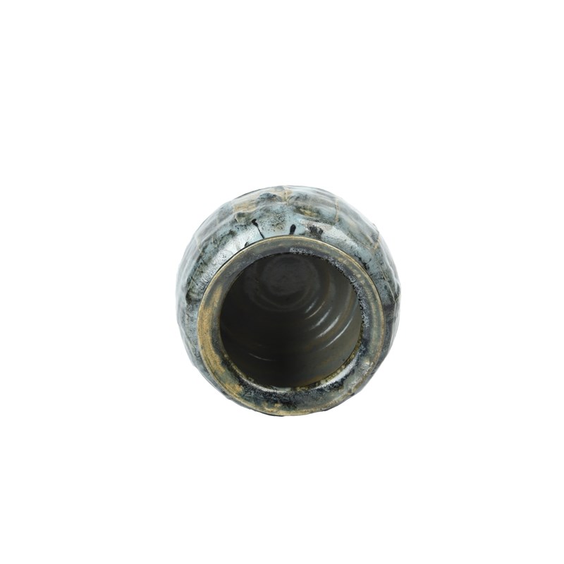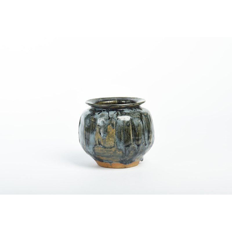compressed form with fluted sides, covered in a blue and grey glaze to the foot
