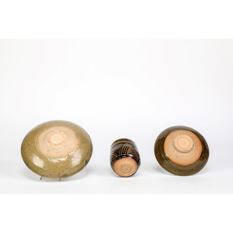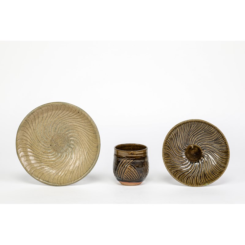 18.5cm diameter; a smaller stoneware footed dish, and a beaker, both by Katharine Pleydell-Bouverie (3).