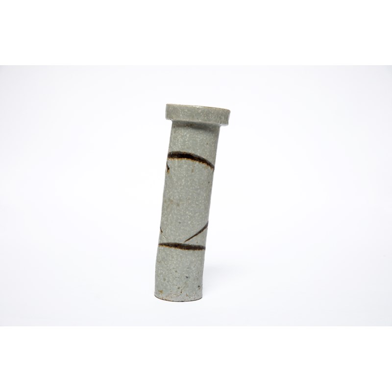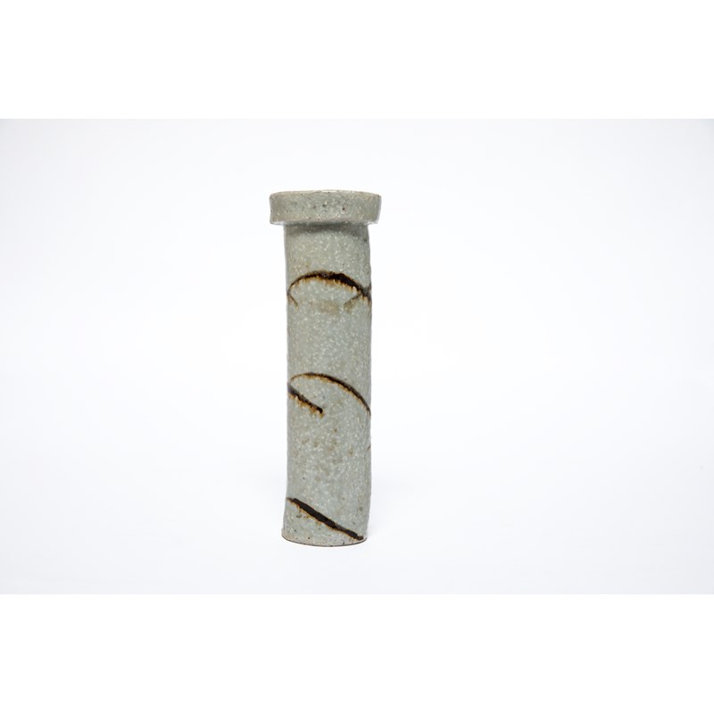 cylindrical form, grogged porcelain with a celadon glaze and iron oxide splashed decoration