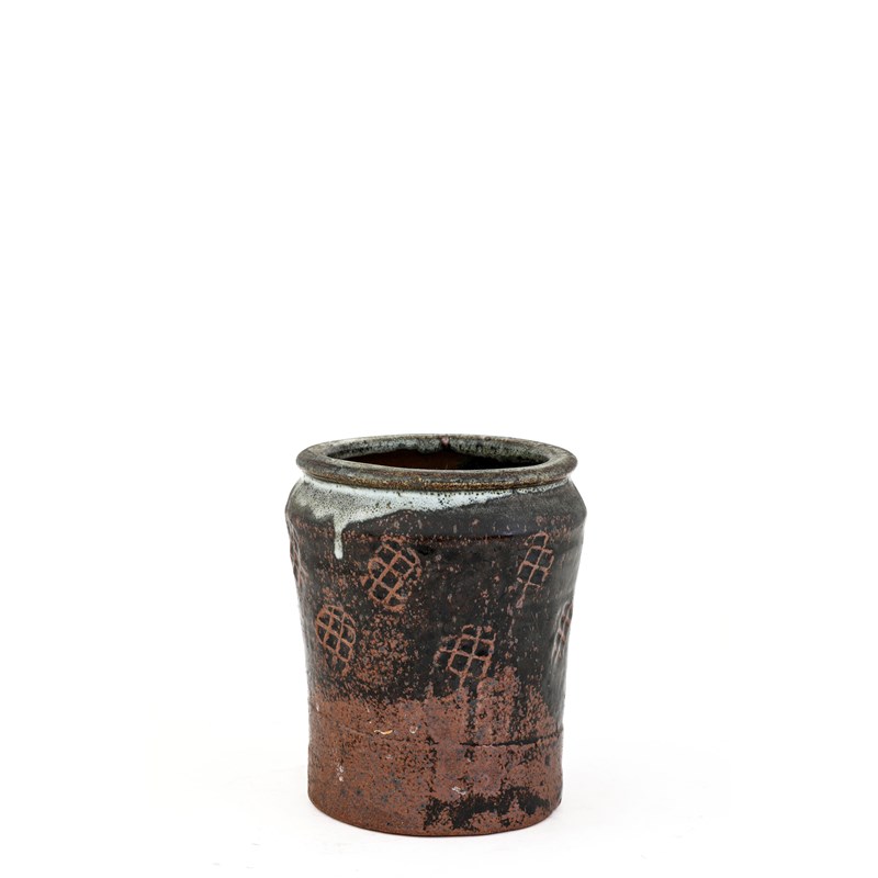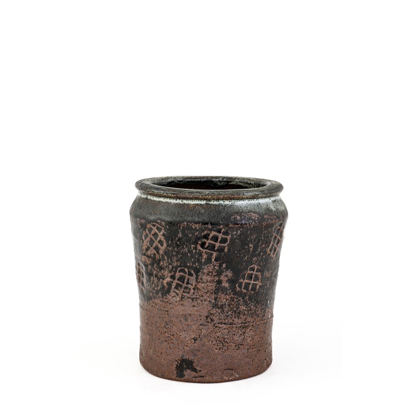 cylindrical form, with a tenmoku glaze and nuka glaze rim, impressed motifs to the body