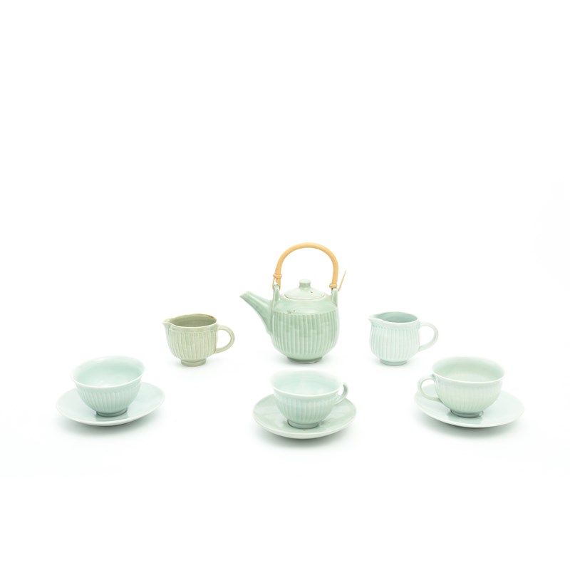 comprising teapot, two cups and saucers, a sugar bowl and saucer, and two jugs