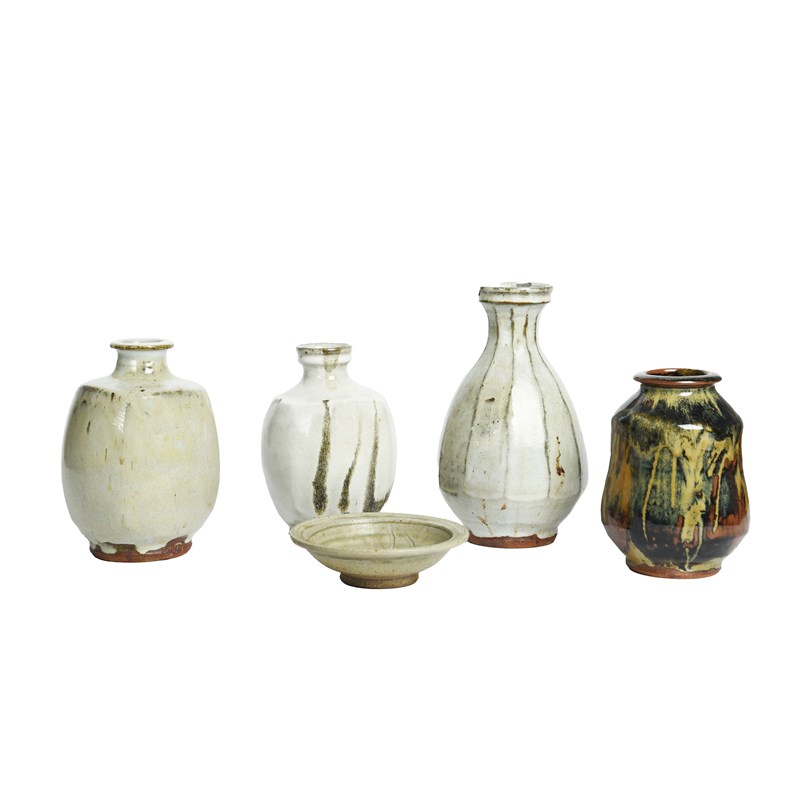 21cm high; and two stoneware vases and a dish by Jim Malone, and a Mike Dodd iron-glaze vase (5).