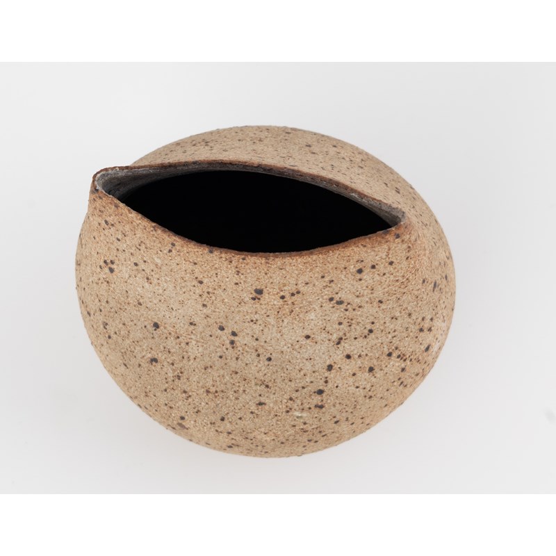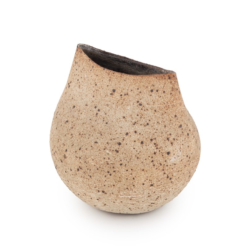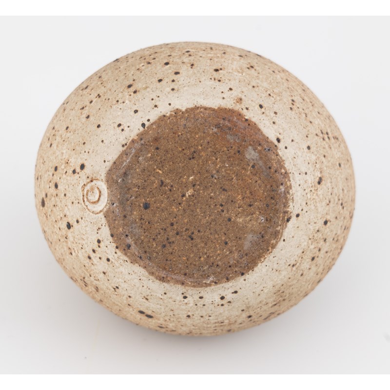 globular form with pinched rim, the oatmeal glaze with iron speckles