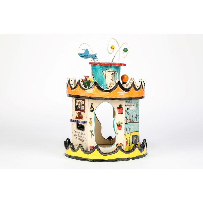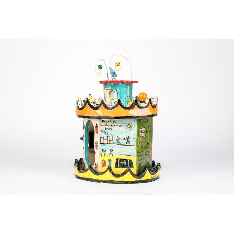 earthenware, fitted with a clock and mirror to the inside, painted with seaside scenes