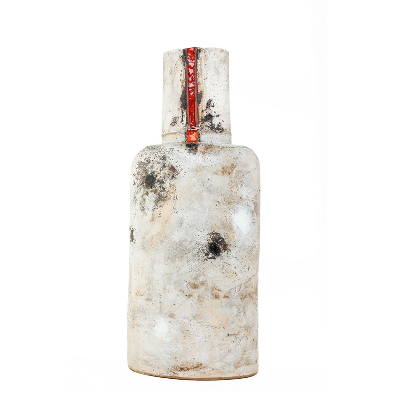 with rounded shoulders and cylindrical neck, covered in a cream glaze with black and red slip