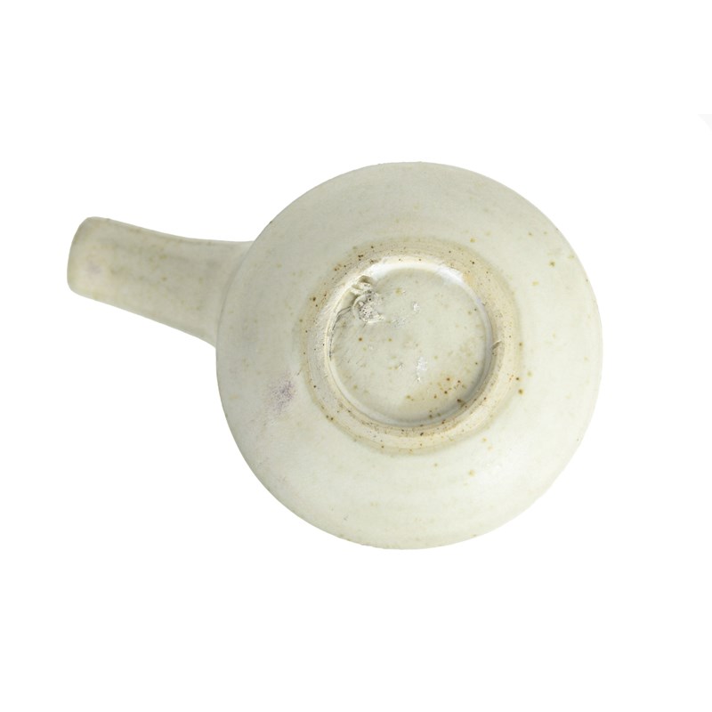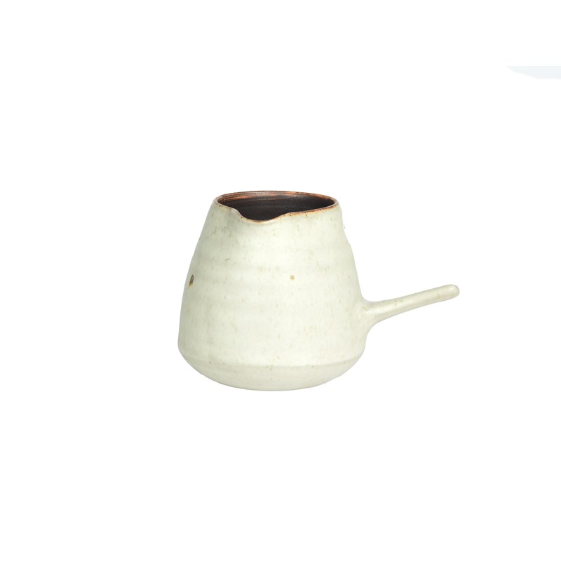 stoneware, tapering form with pulled side handle, glazed silver-grey, the interior manganese