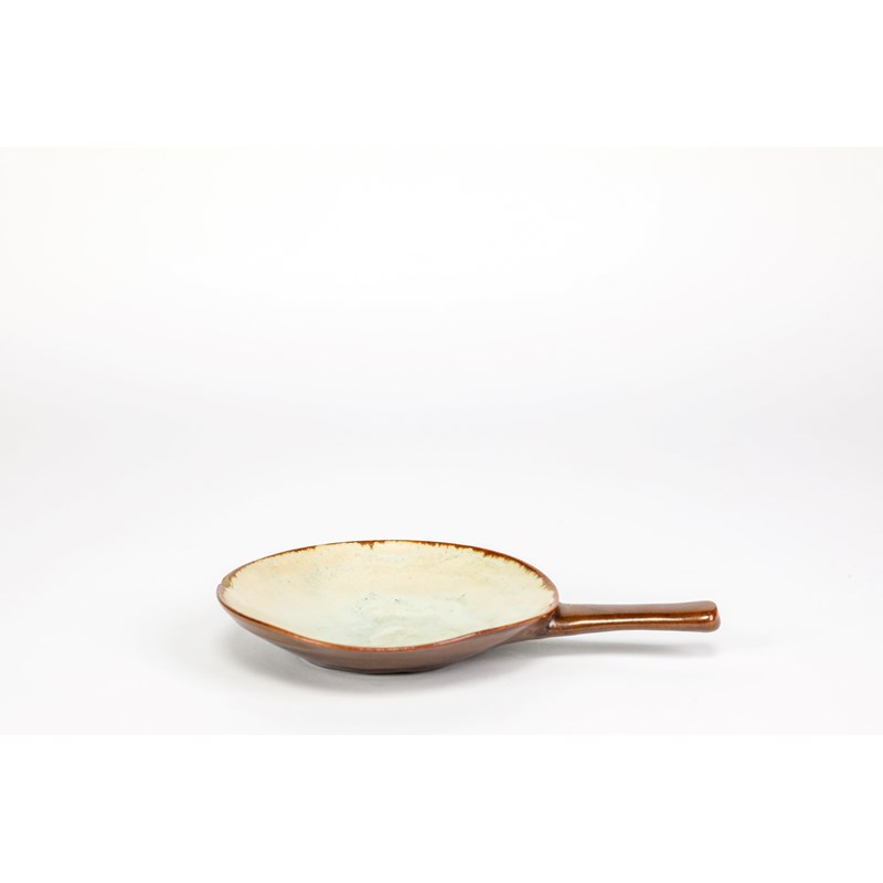 circular with pulled handle, glazed pale celadon to the interior, the exterior chestnut brown