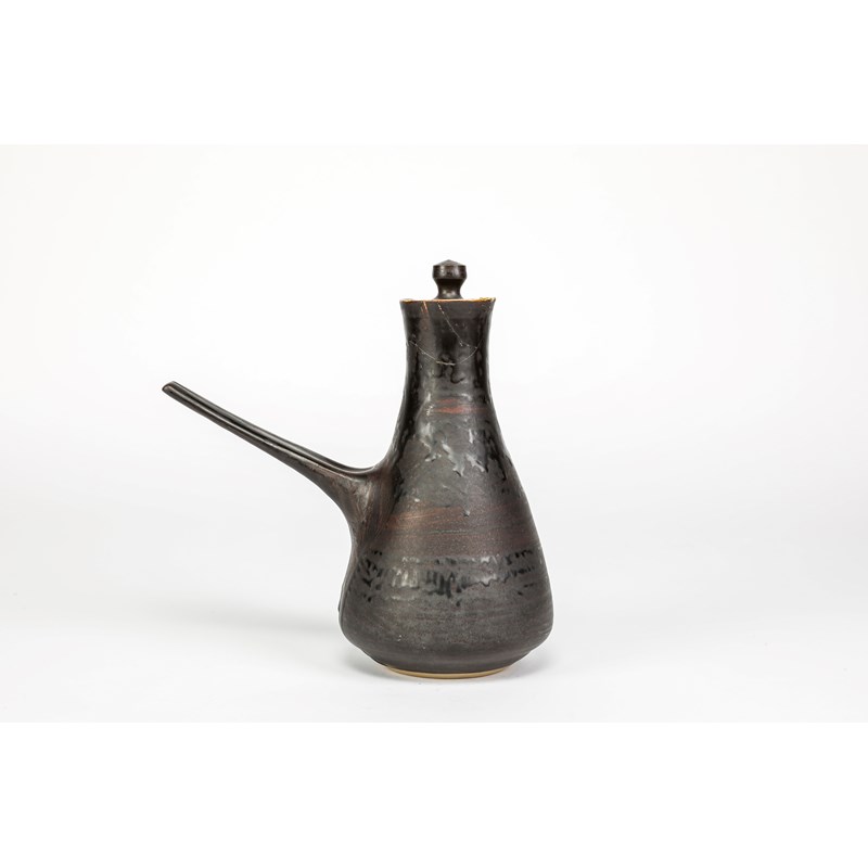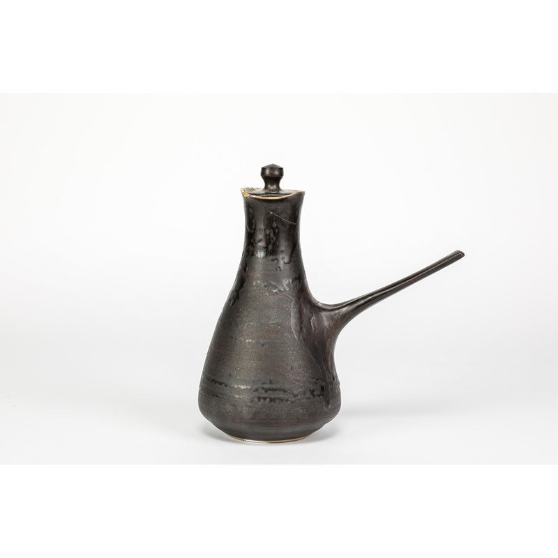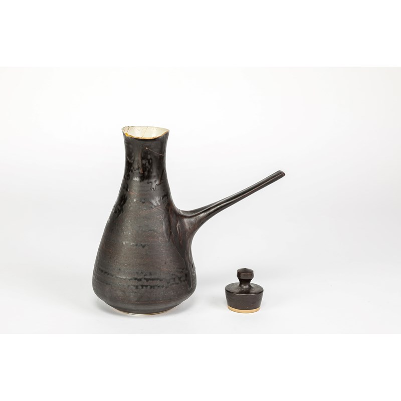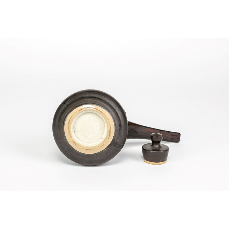 the exterior covered in a manganese glaze, the interior with a cream glaze, elongated handle