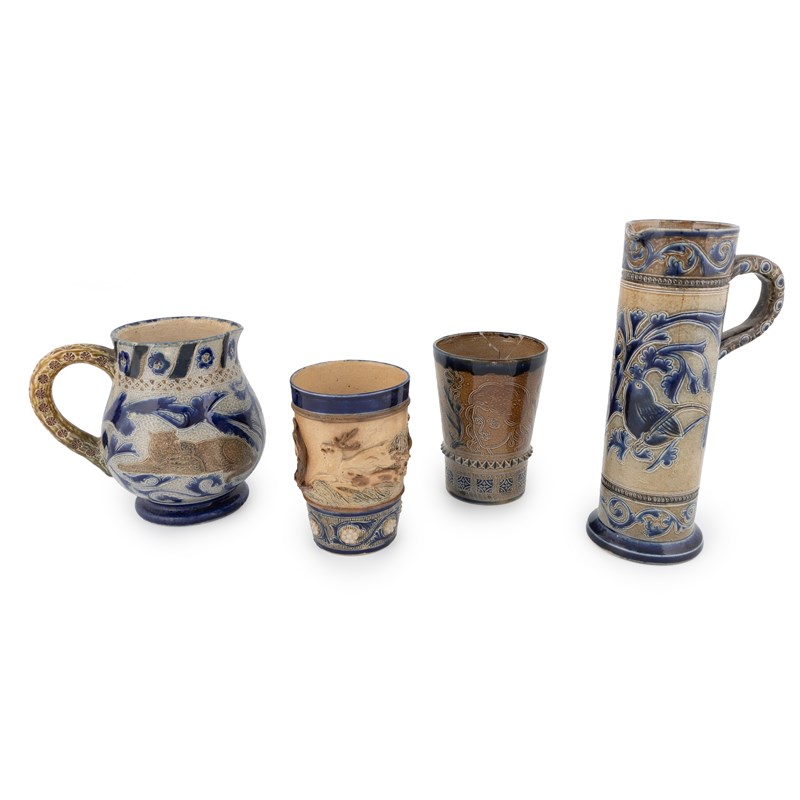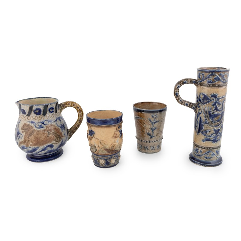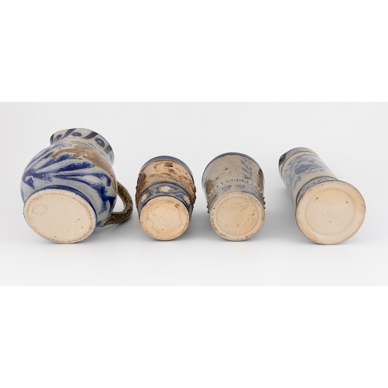 15cm high; with two beakers, and a tall jug, all by Fulham Pottery (4).