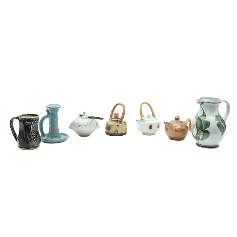 and a smaller Mary Rich teapot, an Ara Cardew teapot, a Derek Emms teapot, a salt glaze mug, and an Aldermaston jug (qty.)