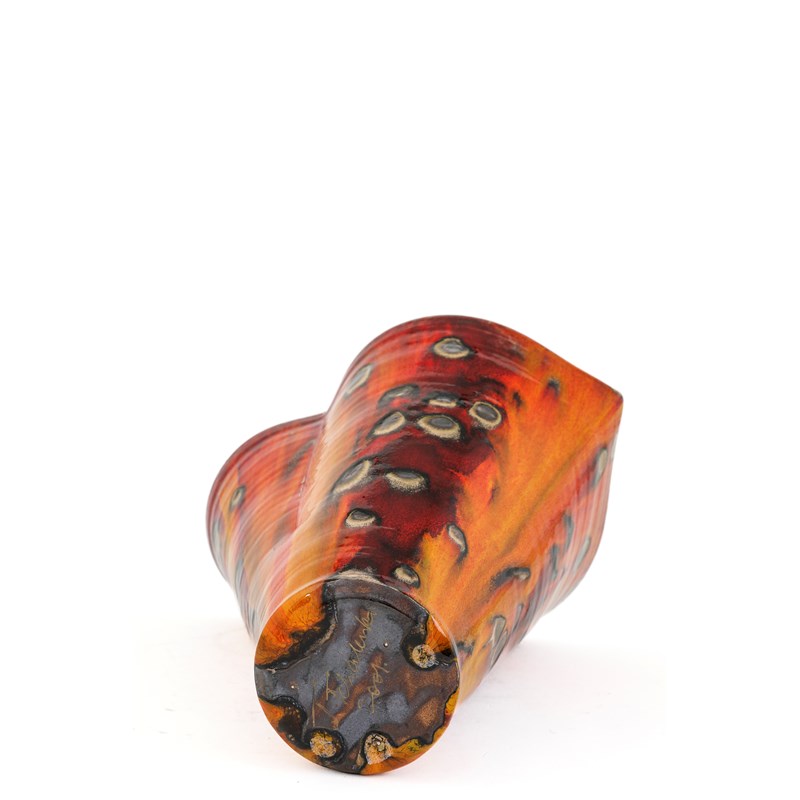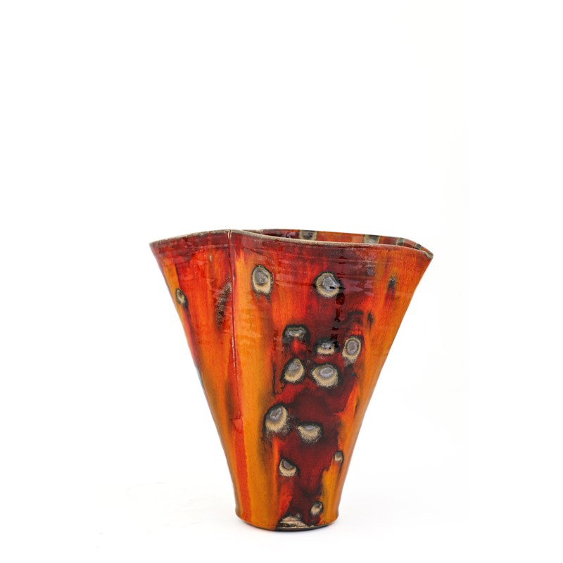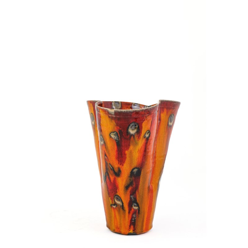 with a red and yellow flowing glaze with manganese spots