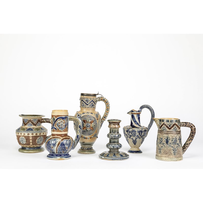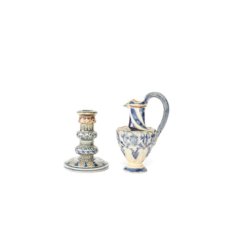 19cm high; and four jugs and a candlestick, all by Edgar Kettle for C.I.C. Bailey Fulham Pottery (6).