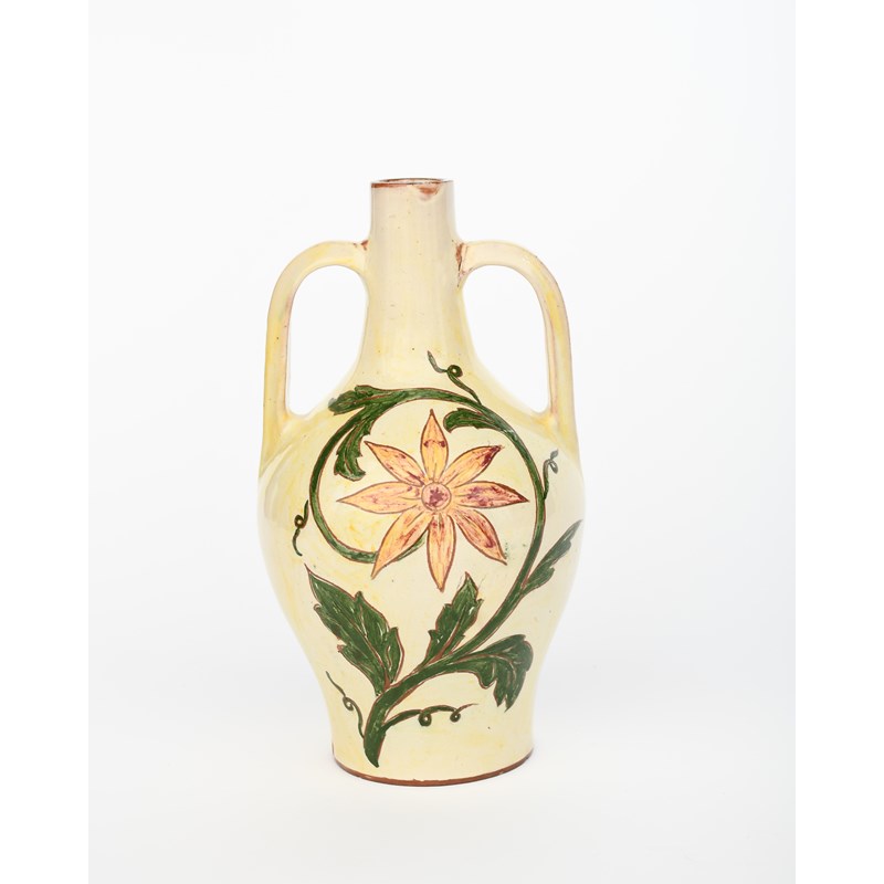 shouldered form with applied twin-handles, incised and painted with a stylised flower stem in red, yellow and green on a pale yellow ground, the reverse with similar berried foliage spray,