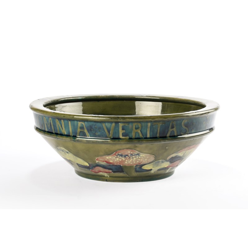 flaring form, tubeline decorated in colours on a streaked green ground, the rim inscribed Veritas facta Non Verba Vincit Omnia, (Truth, Deeds not Words Conquer)