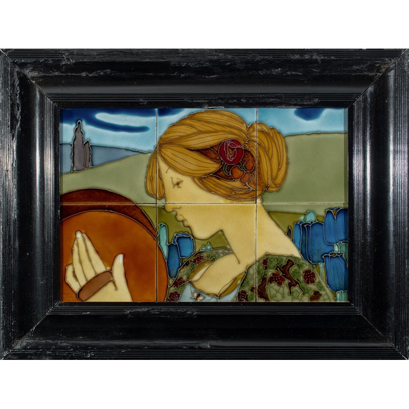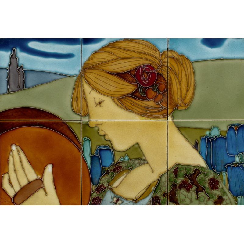 tubeline tiles depicting a maiden in a field of blue flowers, with rolling hills and skyline in the background