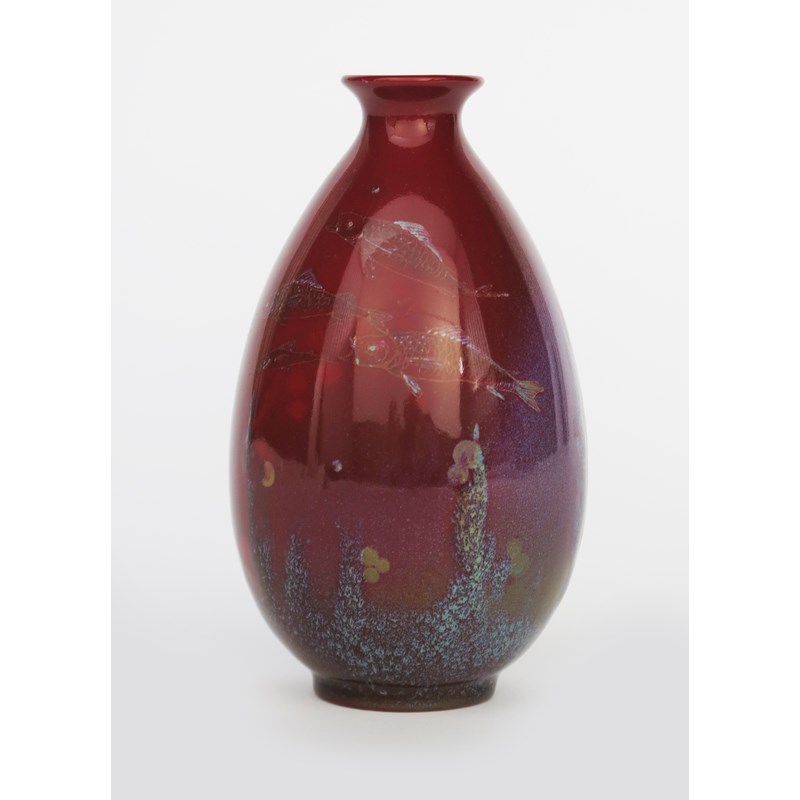 A Royal Doulton Sung vase designed by Charles Noke, slender, ovoid form with everted rim, painted with fish swimming, in pale blue, and turquoise with splashes, on a flambe red ground printed and painted marks, signed Noke and FM monogram, 15cm. high