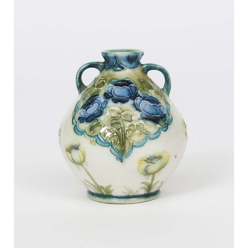 'Poppy Panel' a James Macintyre & Co miniature vase designed by William Moorcroft, ovoid with twin-loop handles, painted in shades of blue, green and yellow on a white ground, printed factory marks, 6.5cm. high