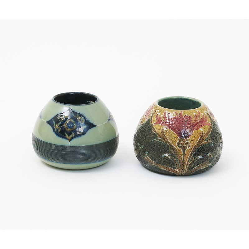'Cornflower' a James Macintyre & Co vesta designed by William Moorcroft, painted in shades of red and green on a sand ground, and another Macintyre vesta designed by William Moorcroft printed factory marks, first signed in green, 6cm. high, (2)