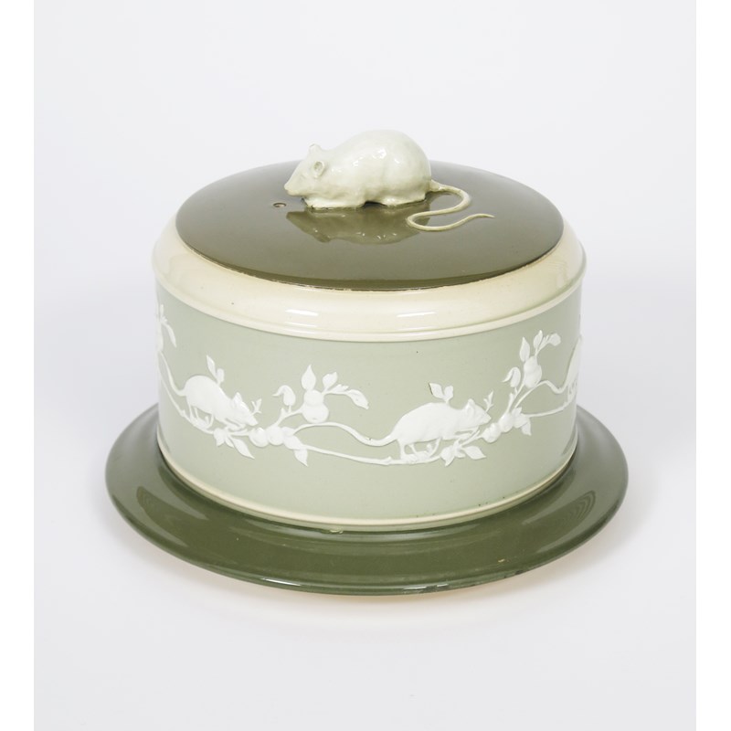 A James Macintyre & Co Washington Faience stilton dish and cover, the domed cover set with modelled mouse finial, and decorated in low relief in white with mice running along a fruiting bough, on a celadon ground, printed factory mark, small chip to rim and ear, 16cm. high
