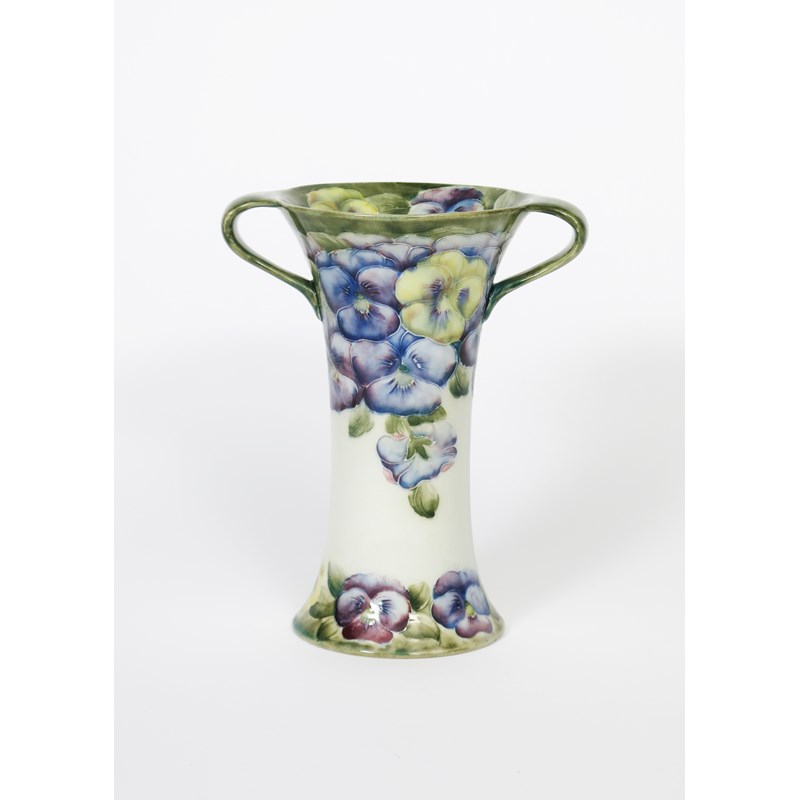 'Pansy' a James Macintyre & Co twin-handled vase designed by William Moorcroft, waisted cylindrical form with loop handles, tubeline decorated with pansy flowers in shades of yellow, purple, pink and green on a white ground, printed factory mark, painted green signature, professional restoration to base rim, 20cm. high