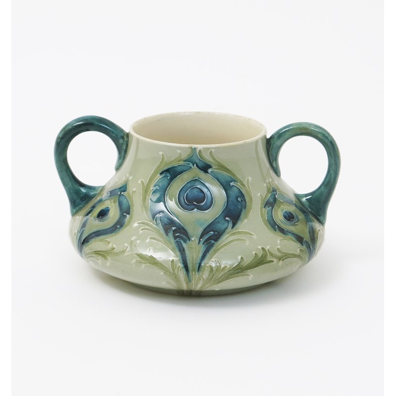 'Peacock Feathers' a Moorcroft Pottery sugar basin designed by William Moorcroft, twin-handled form, painted with Art Nouveau peacock feathers in blue and green on a celadon ground, painted green signature, 7.5cm. high