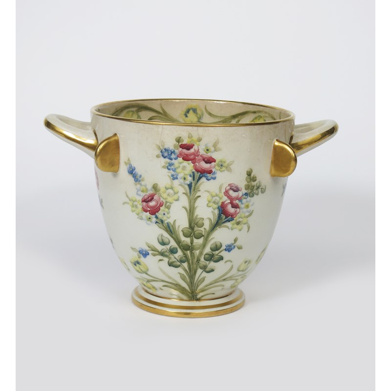 'Floral Spray' a James Macintyre & Co jardiniere designed by William Moorcroft, footed form with applied twin-handles, tubelined and painted in colours, highlighted in gilt on a white ground, printed factory mark, painted green facsimile signature, hairline from top rim, crazed, 20.5cm. high