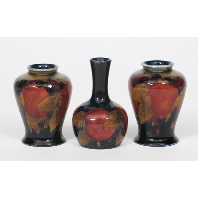 'Pomegranate' a near pair of Moorcroft Pottery vases designed by William Moorcroft, painted in shades of purple, pink and blue on a mottled green and blue ground, and another Moorcroft 'Pomegranate' pattern vase impressed factory marks, chip to top rim of one vase, solifleur vase restored, 9cm. high, (3)